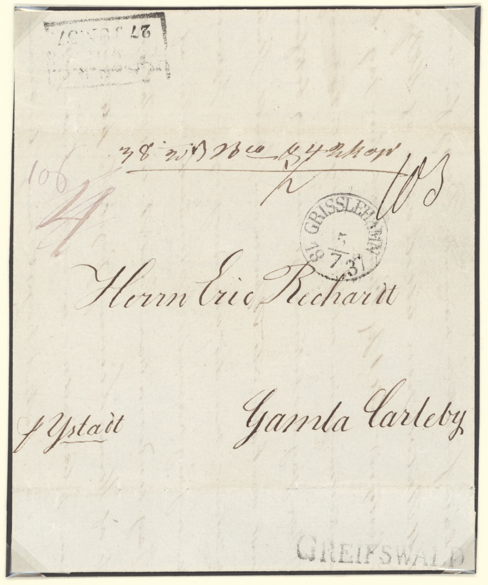 1837 (27 June) entire letter from Hamburg to Gamla Carleby with a variety of manuscript rate markings, Grisslehamn datestamp, on reverse