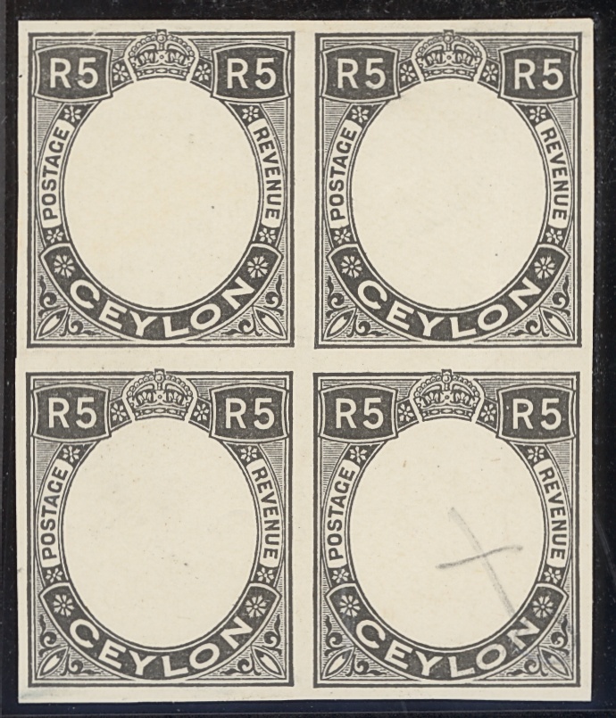1927-29 5r. frame only imperforate plate proof, a block of four on surfaced paper showing printer's correction mark in pencil at lower right, scissor-cut in the centre margin at left, fine