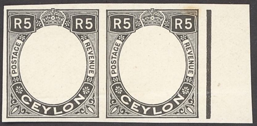 1927-29 5r. frame only imperforate plate proof horizontal pair with margin at right on surfaced paper, tiny stain at top right and horizontal crease towards foot