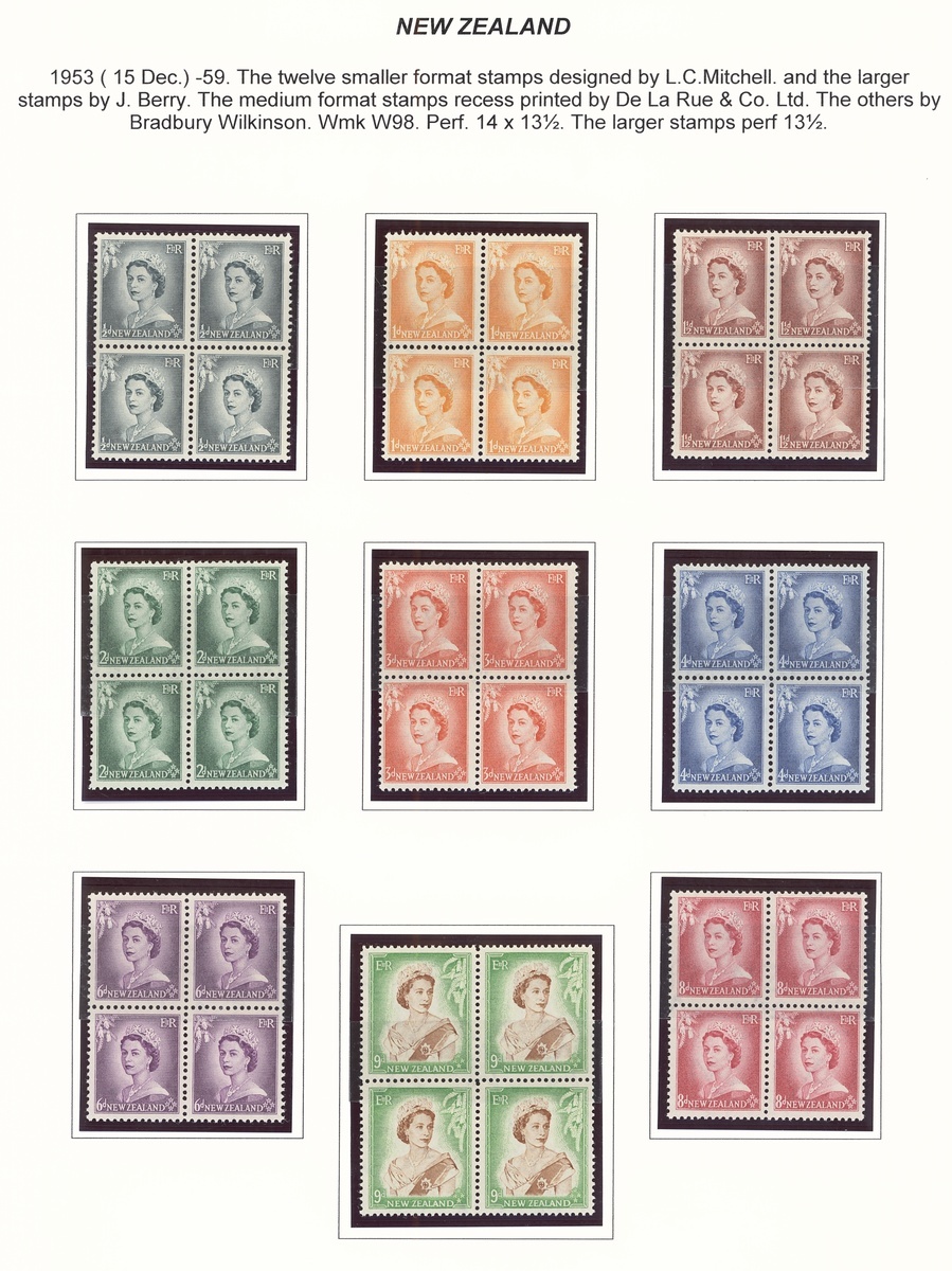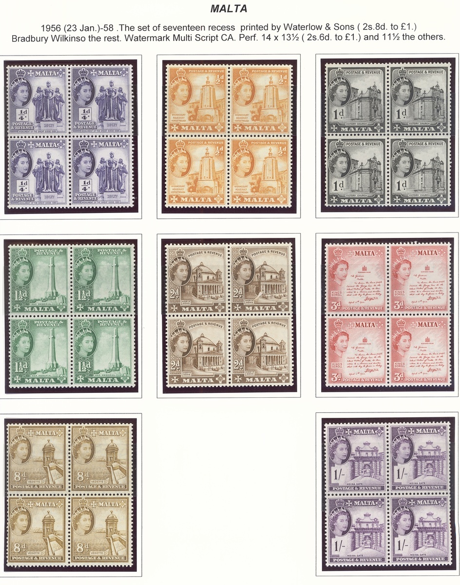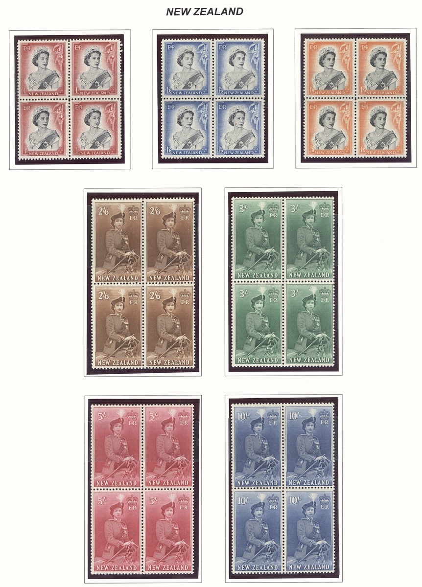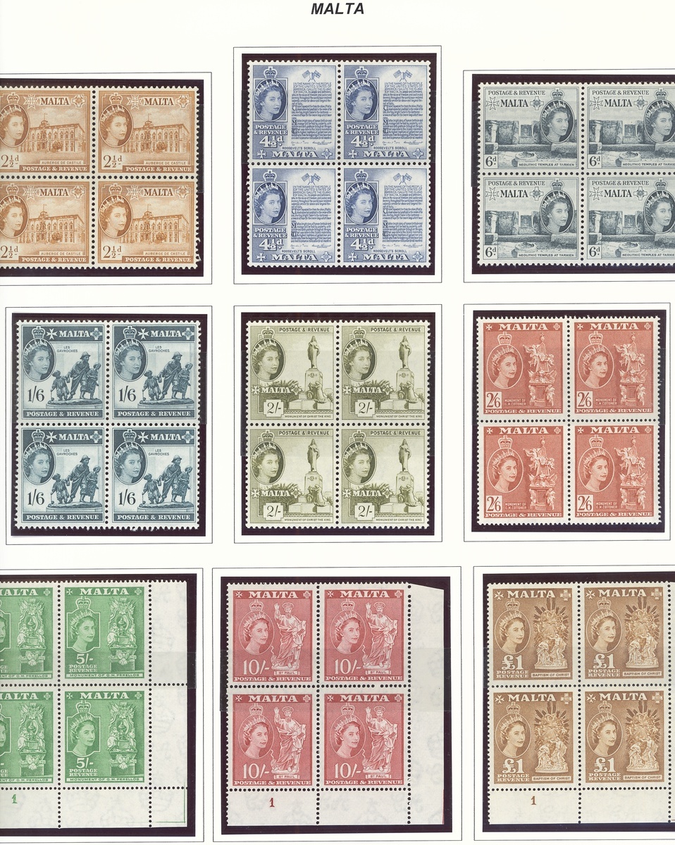 1953-65 mint collection of QEII sets in blocks of four including Australia 1963-65 set of six to £2, Malaya Penang 1954-57 set of eleven to $5 in corner blocks with plate numbers, Malta 1956-58 set of seventeen to £1, New Hebrides 1953 set of eleven to 5fr., New Zealand 1953-59 set of sixteen to 10/-, Sierra Leone 1956-61 set of fifteen to £1( each in vertical pairs); fine and fresh unmounted mint. Cat. £2,100+