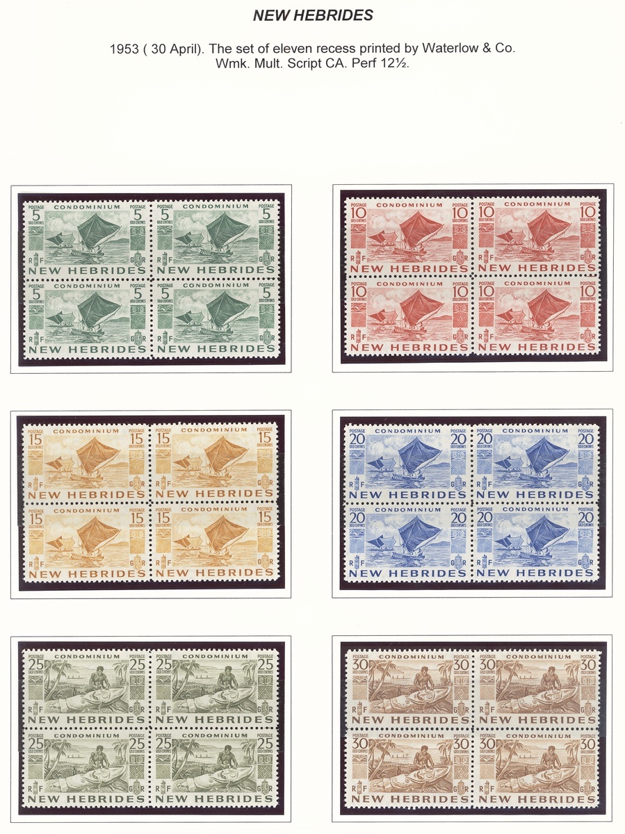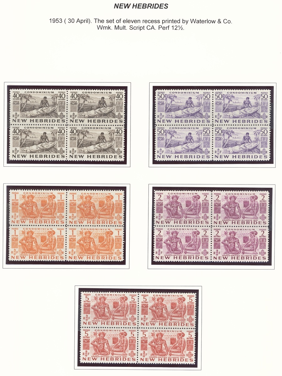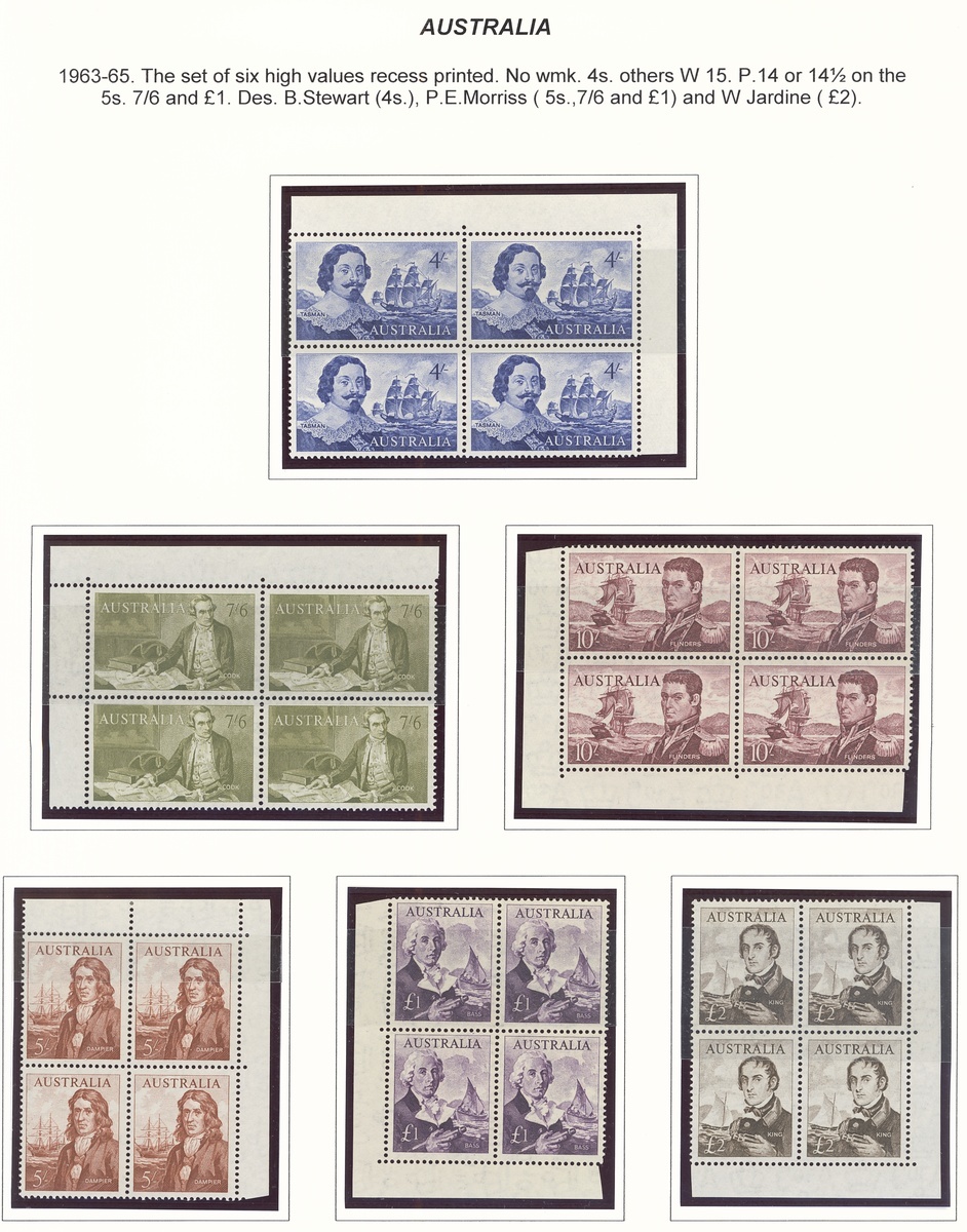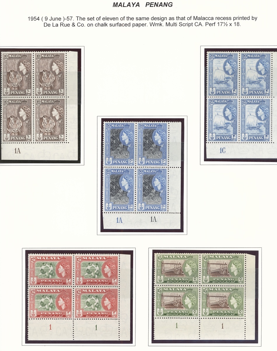 1953-65 mint collection of QEII sets in blocks of four including Australia 1963-65 set of six to £2, Malaya Penang 1954-57 set of eleven to $5 in corner blocks with plate numbers, Malta 1956-58 set of seventeen to £1, New Hebrides 1953 set of eleven to 5fr., New Zealand 1953-59 set of sixteen to 10/-, Sierra Leone 1956-61 set of fifteen to £1( each in vertical pairs); fine and fresh unmounted mint. Cat. £2,100+