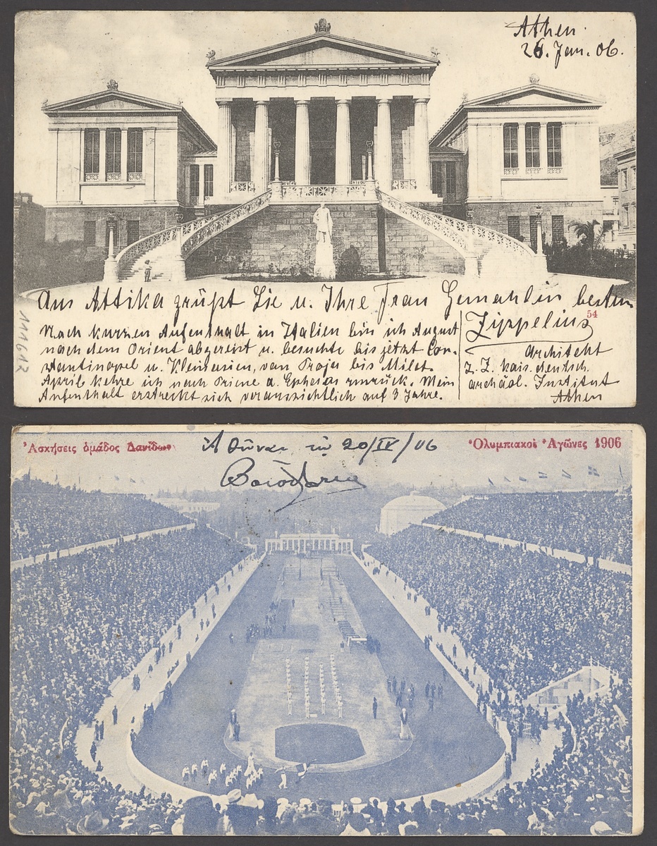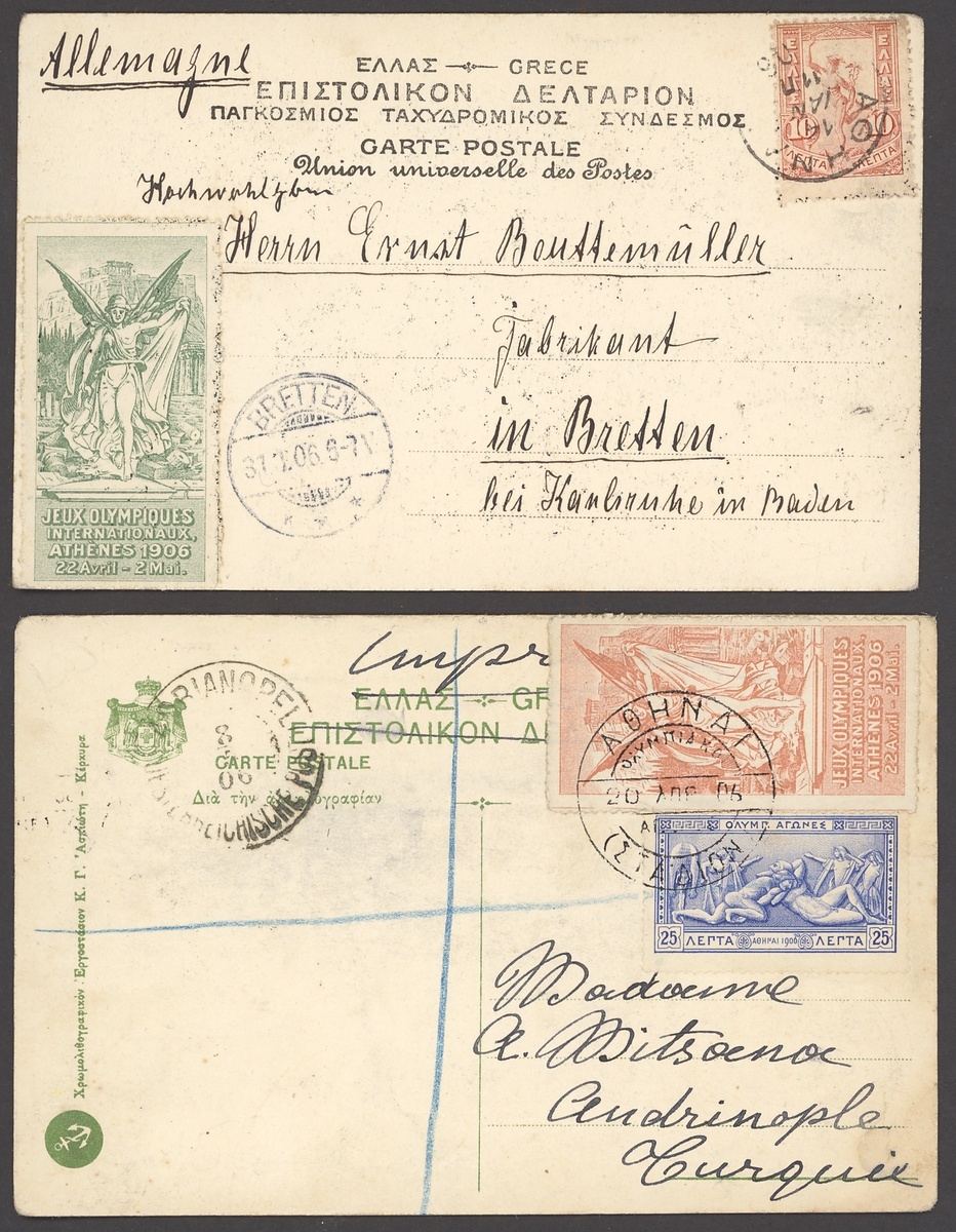 Athens: 1906 picture postcard (Olympic Stadium) to Turkey franked 1906 25L. and with vignette in orange, both tied by Athens c.d.s., also picture postcard (Athens) to Germany franked 1901 10L.. and with green vignette; some small faults