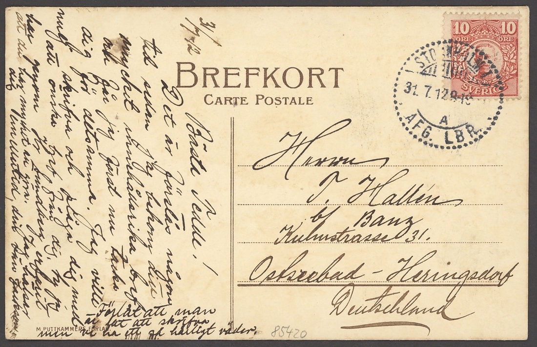 Stockholm: 1912, special Olympic card showing the Swedish flag and Olympic badge, addressed to Germany and franked 10oe. with Stockholm/AFG. LBR cancellation; fine