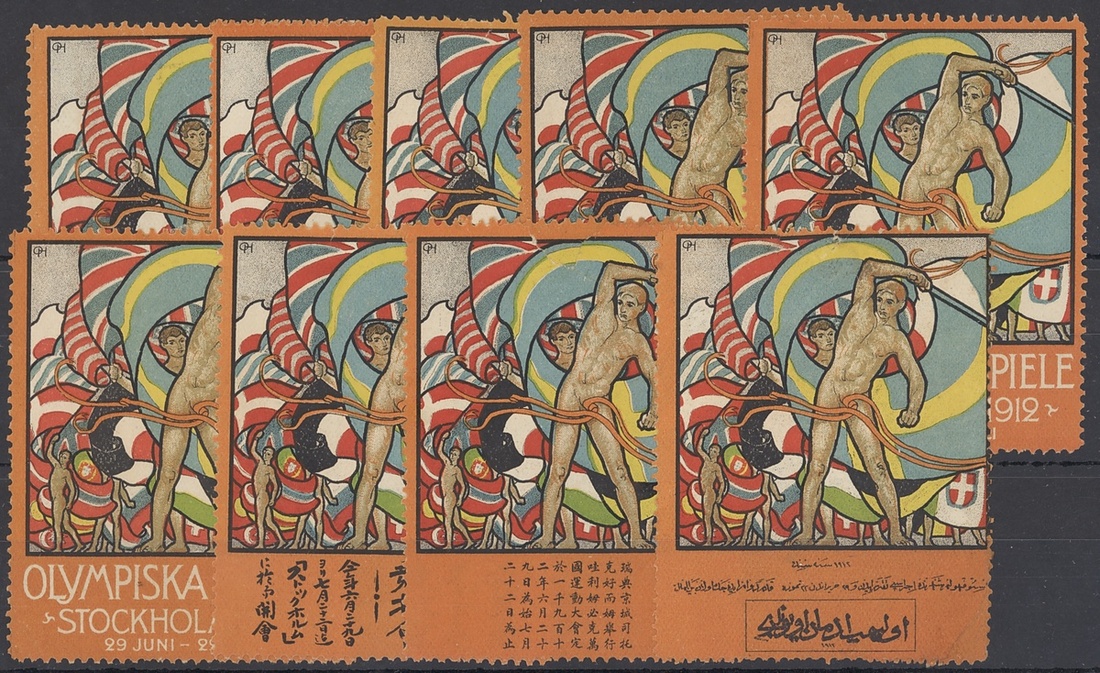 Stockholm: 1912, nine multicoloured labels, each inscribed in a different language, part original gum; one a little defective and some slight gum staining