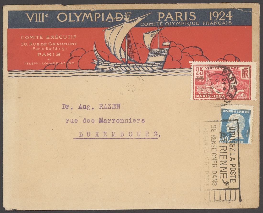Paris: 1924, special "Comite Executif" blue and red envelope franked Olympic 25c. and Pasteur 50c., addressed to Luxembourg; a few small perimeter faults, fine