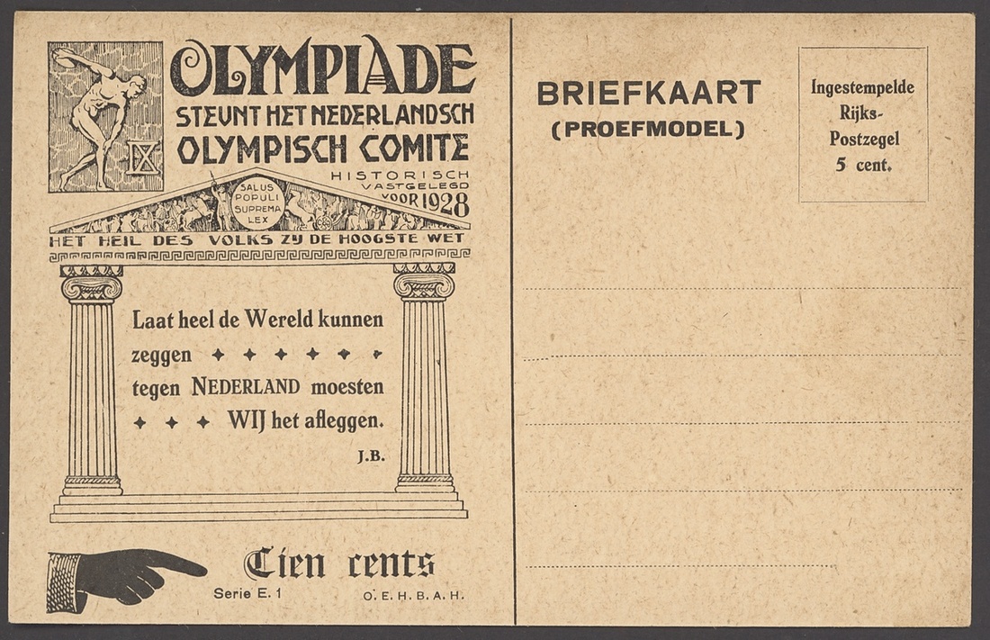 Amsterdam: 1928 essay for 5c. postal stationery card in black, showing a discus thrower and with four line inscription and E1 below; small water stain on reverse, fine and rare
