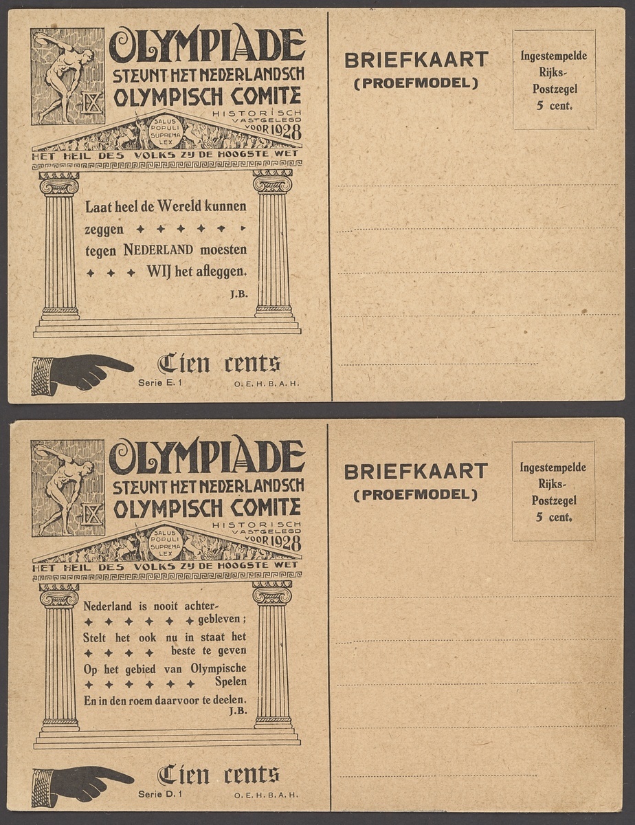 Amsterdam: 1928 essay for 5c. postal stationery card in black, showing a discus thrower and with four line inscription and E1 below; also a similar Essay with seven line inscription and D1 below, fine and rare