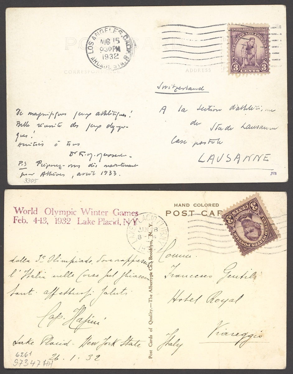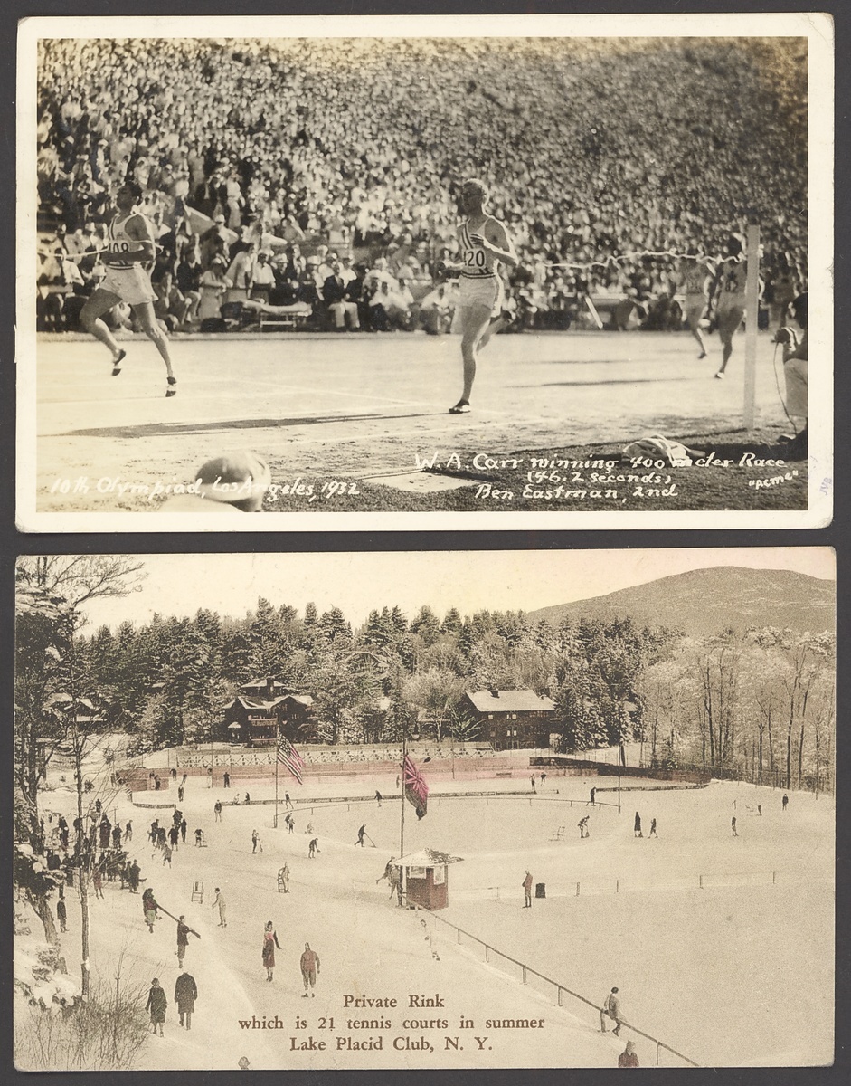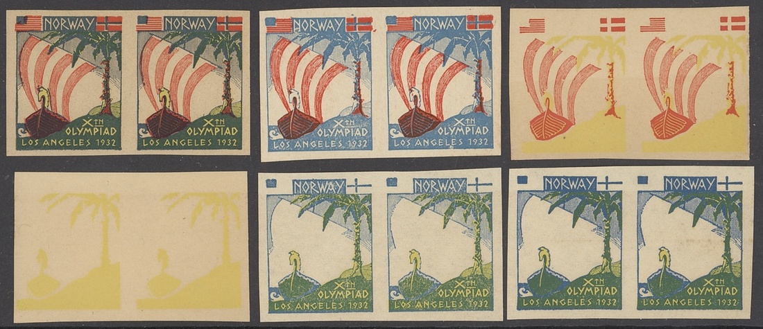 Los Angeles: 1932 picture postcard (W.A. Carr winning 400 meter race) franked Sprinter 3c., addressed to Switzerland, handcoloured picture postcard (Private Rink which is 21 tennis courts in summer, Lake Placid Club, N.Y.), franked Lincoln 3c. addressed to Italy and with "World Olympic Winter Games/Feb. 4-13, 1932, Lake Placid, N.Y. handstamp. Also Norway set of six progressive proofs for a label in pairs,