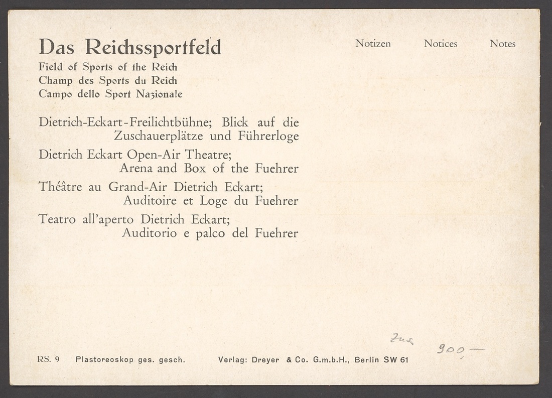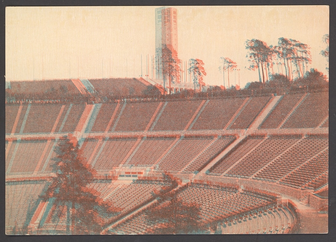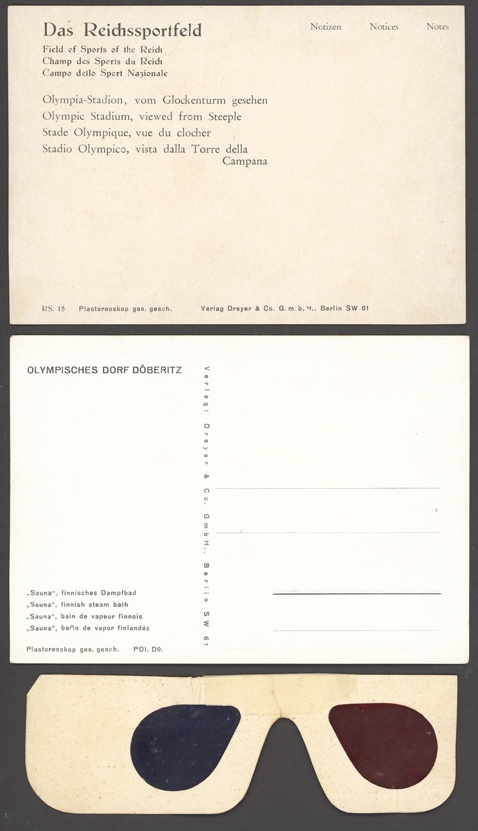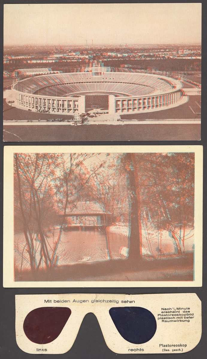Berlin: 1936, three "3 dimentional" picture postcards (Olympisches dorf Dobernitz and 2 views of Das Reichssportfeld), unused and with the special "glasses" for viewing