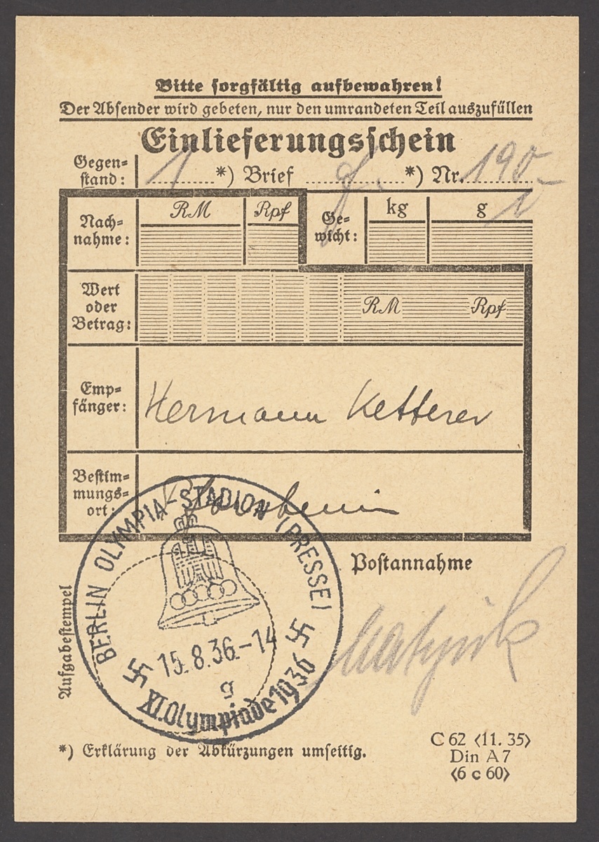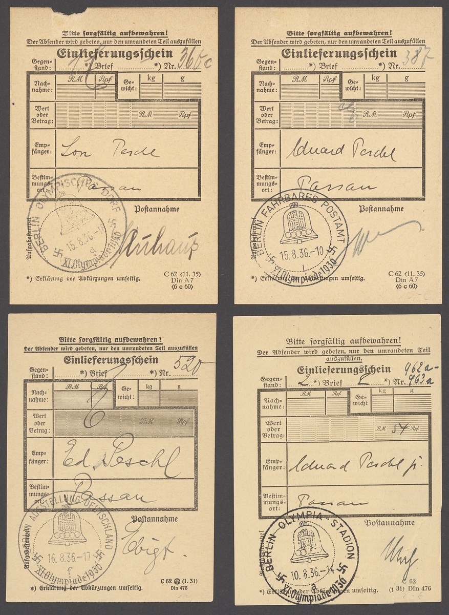 Berlin: 1936, five registered letter receipts, all with different special Games cancellations; good to fine