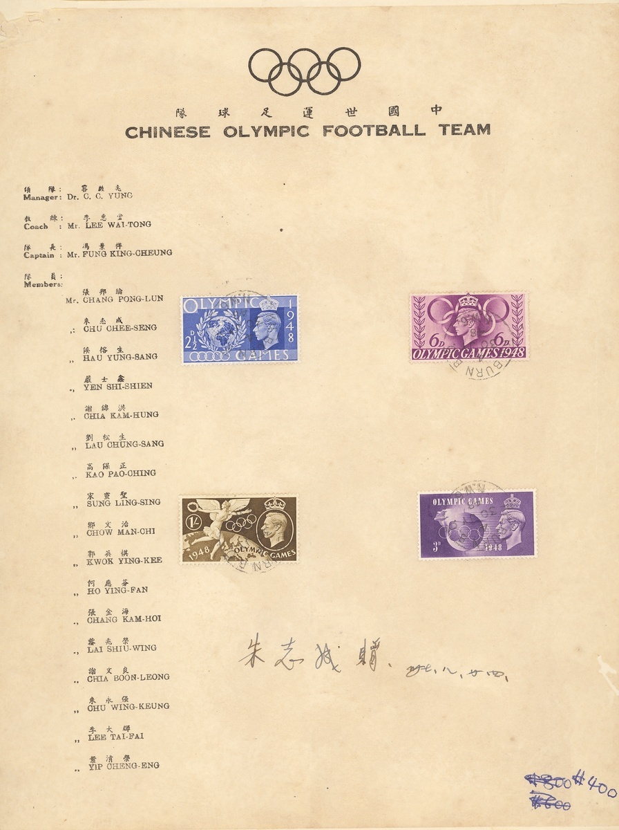 London: 1948, a sheet of note paper headed "Chinese Football Team" with the names of the Manager, Coach and squad, bearing the Great Britain Olympic Games set; the page had been attached to an album page and has faults, nevertheless rare