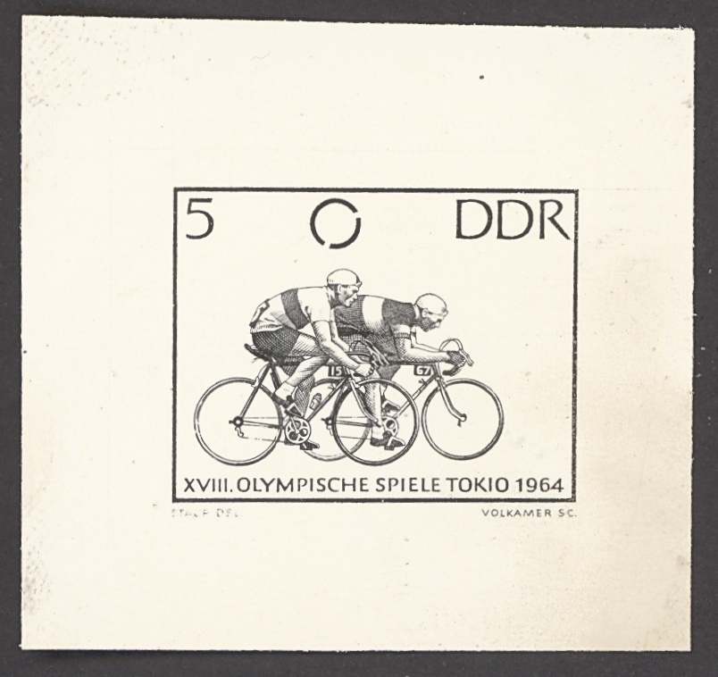 Tokyo:1964, East Germany Cycling 5pf. proof in black on thick ungummed paper (48 x 45mm.); fine and rare