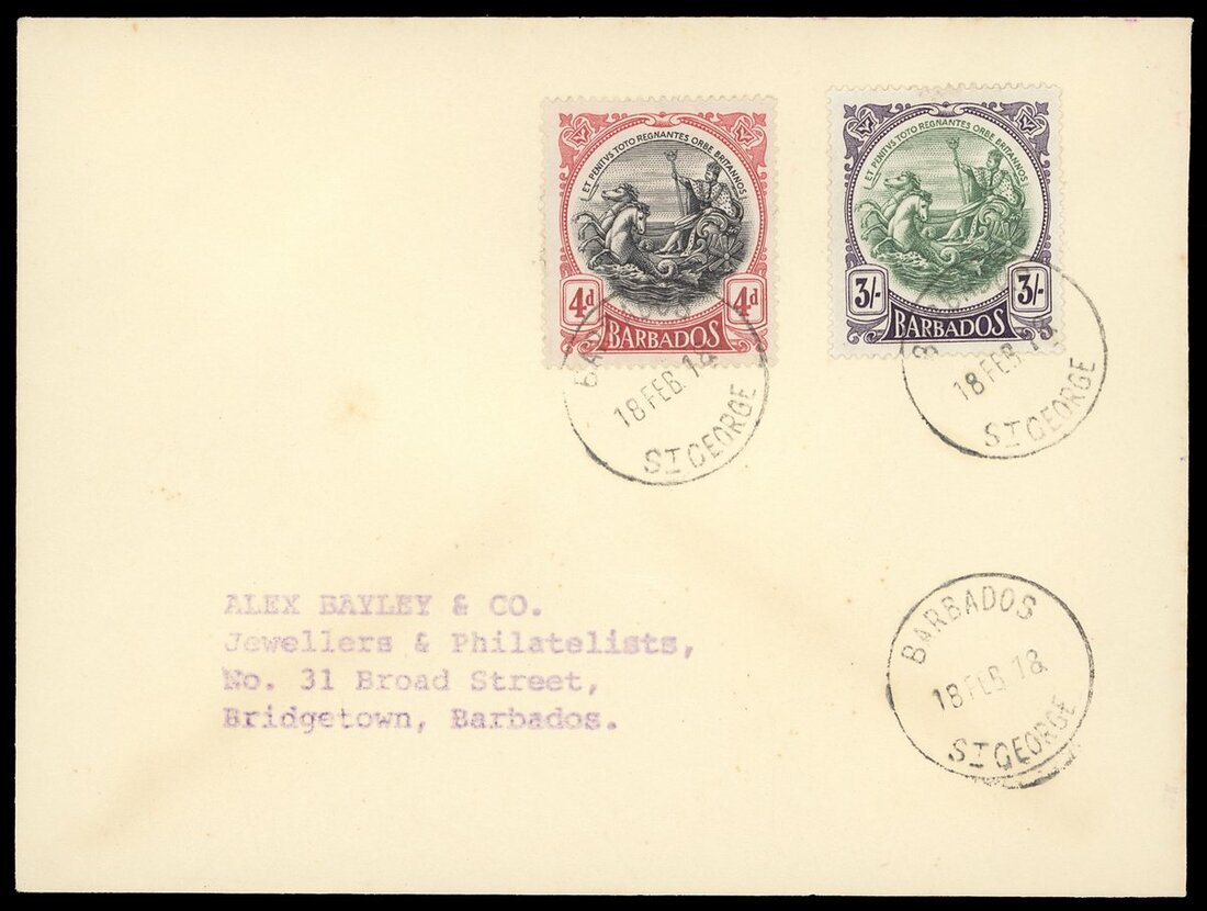 1918 (18 Feb.) envelope to Bridgetown, bearing 4d. black and red and 3/- green and deep violet, both neatly tied by St. George c.d.s., fine