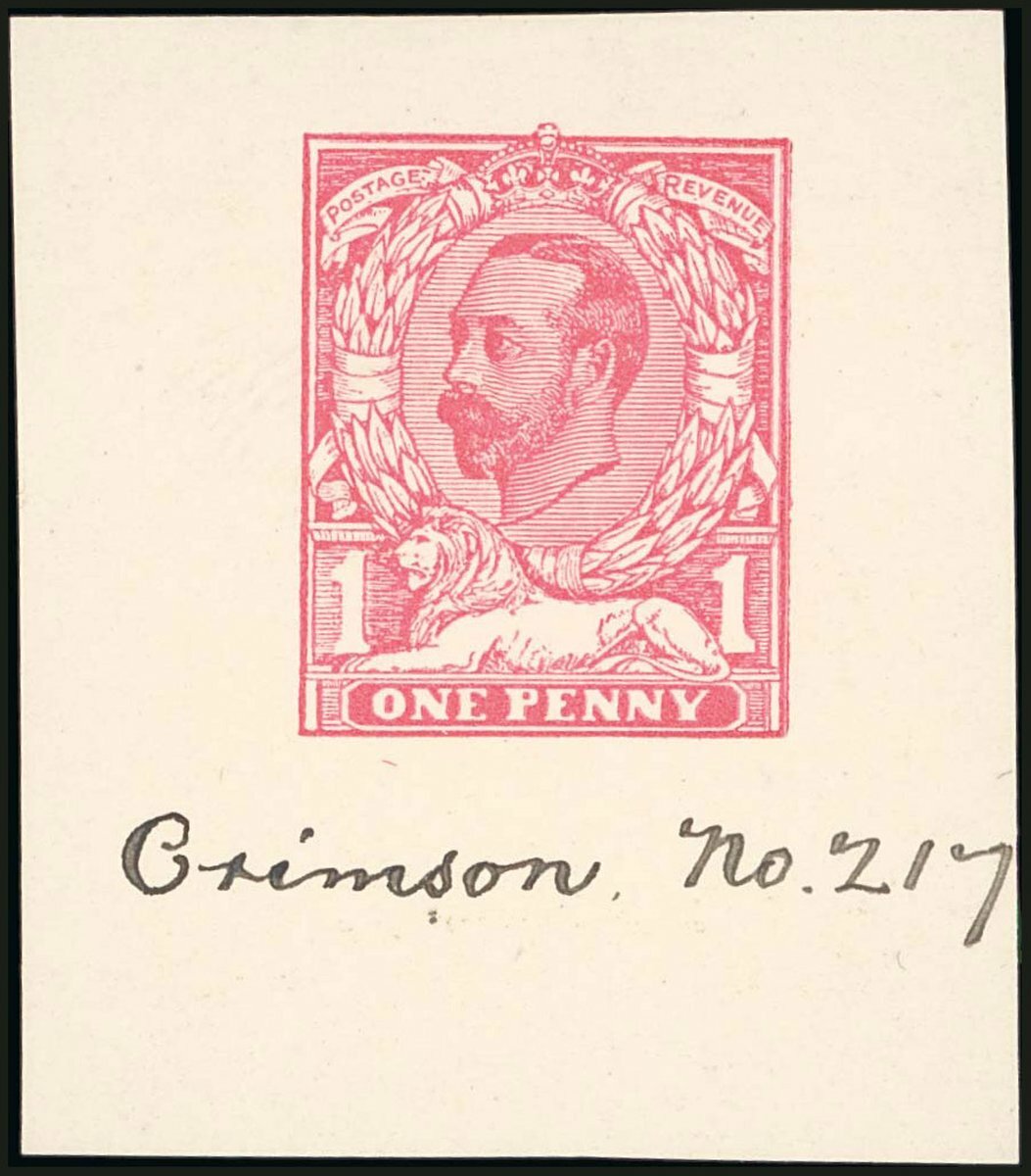 1d. crimson on white unwatermarked paper (36x41mm), manuscript "Crimson No. 217" below the design; fine. Photo.