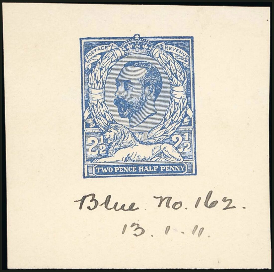 2½d. blue on white unwatermarked paper (41x42mm) with "Blue no.162/13.1.11" in ink below the design; fine. Photo