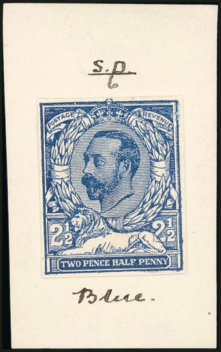 2½d. deep blue on unwatermarked paper, cut-close and affixed to a piece of wove paper (27x35mm) with ink manuscript "SD/6" above the design and "Blue" below; fine. Photo