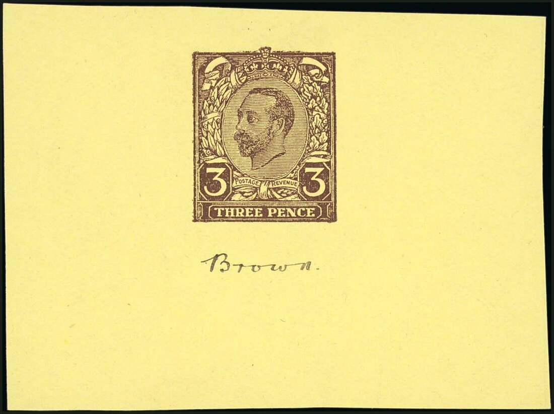 3d. dark brown on thin yellow wove paper (70x52mm), ink manuscript "Brown" below the design, fine. Fresh and attractive. Photo