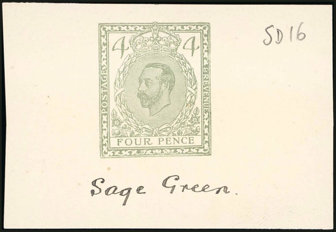 4d. dull sage-green on white wove paper (53x36mm), with ink manuscript "Sage Green" below the design and non-contemporary pencil "SD16" at right; fine. Photo