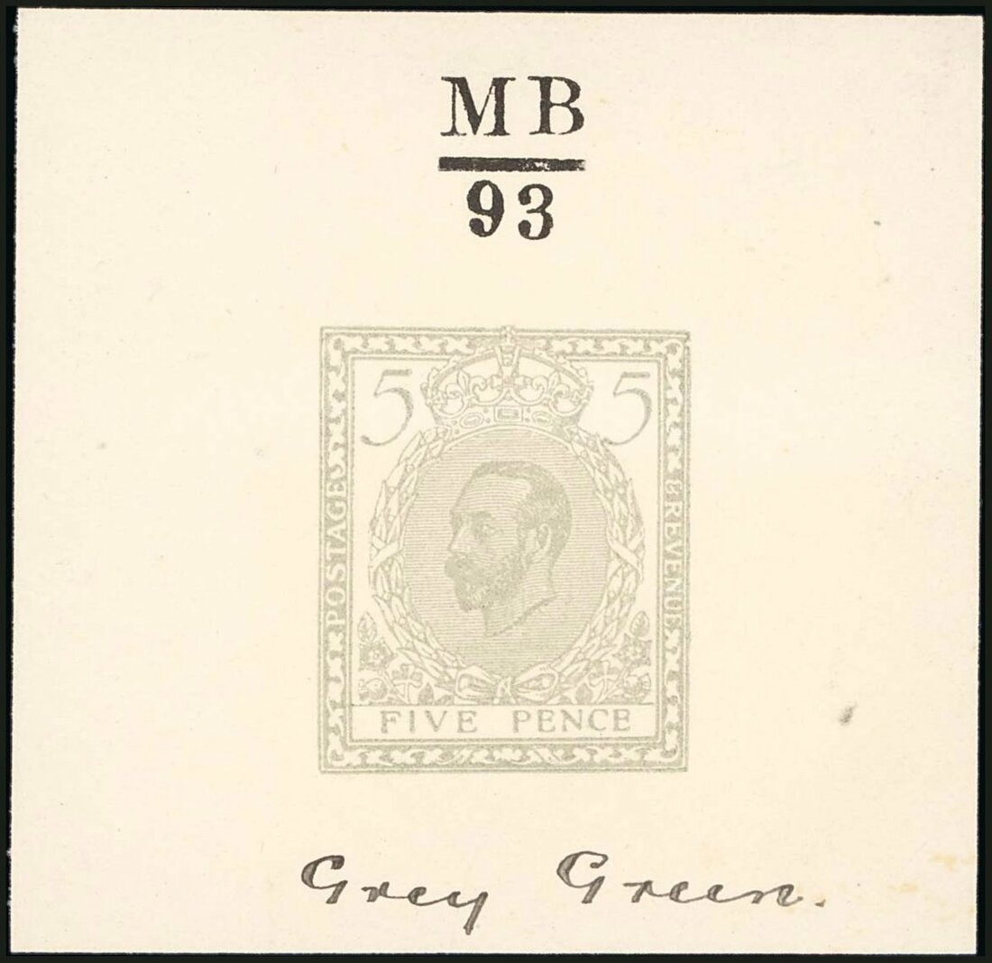 5d. pale dull green, on white wove paper (48x45mm) with handstruck "MB/93" above the design and ink manuscript "Grey Green" below; fine and attractive. Photo