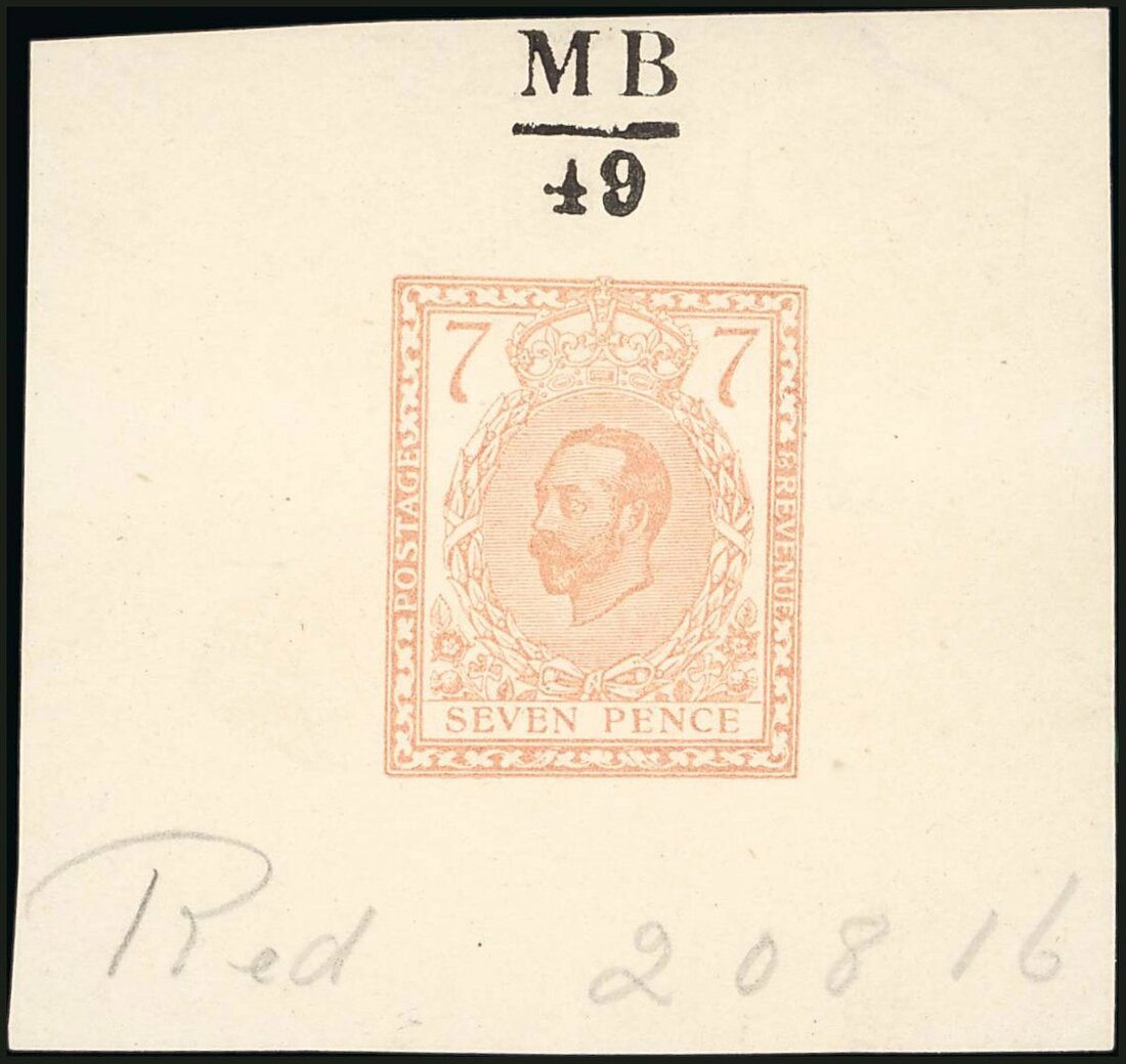 7d. dull rose-red, on white wove paper (48x45mm) with handstruck "MB/49" above the design and pencil "Red 208i6" below; fine and attractive. Photo