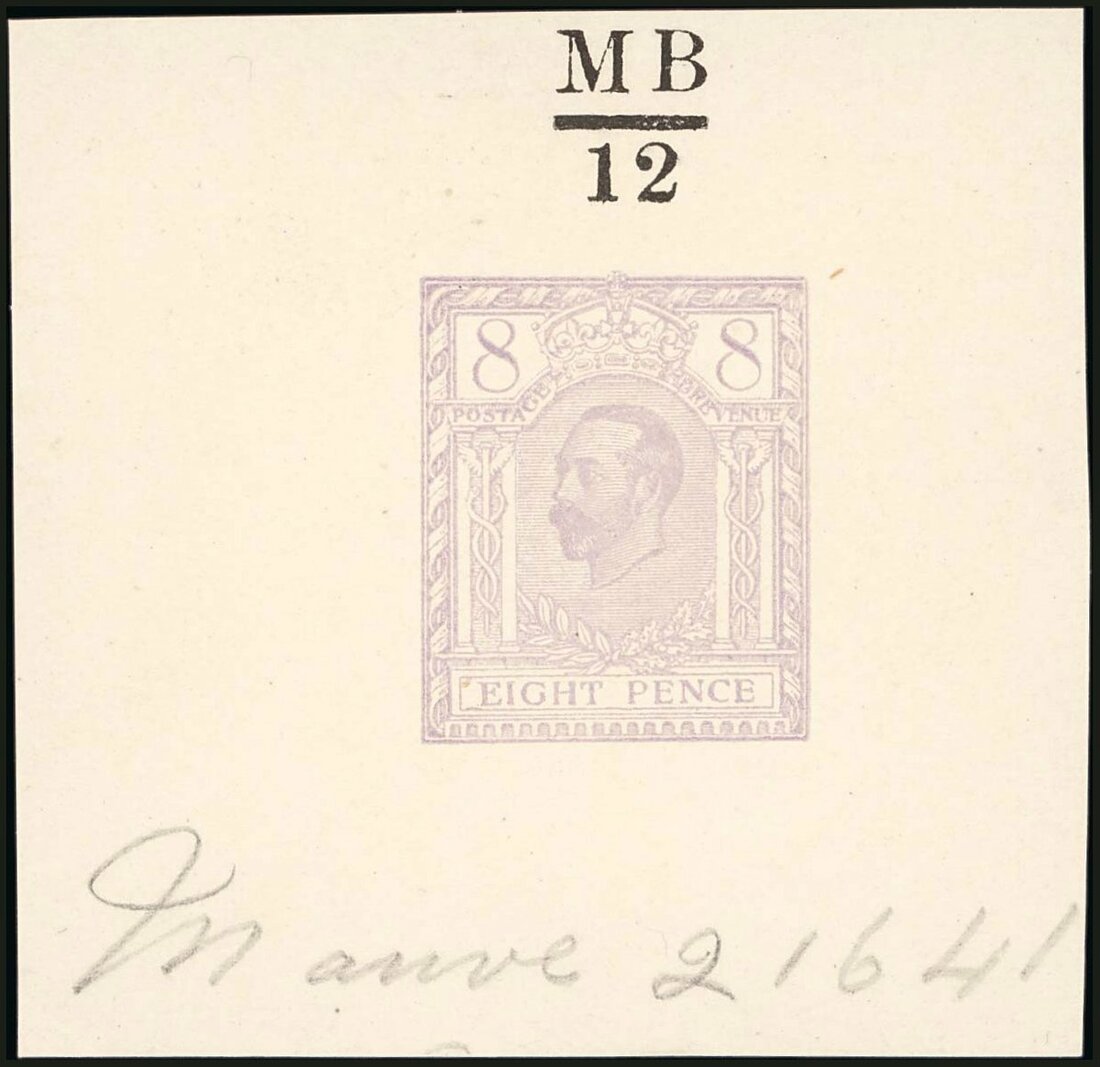 8d. very pale lilac, on white wove paper (50x50mm) with handstruck black "MB/12" above the design and pencil "Mauve 21641" below the design, fine and attractive. Photo