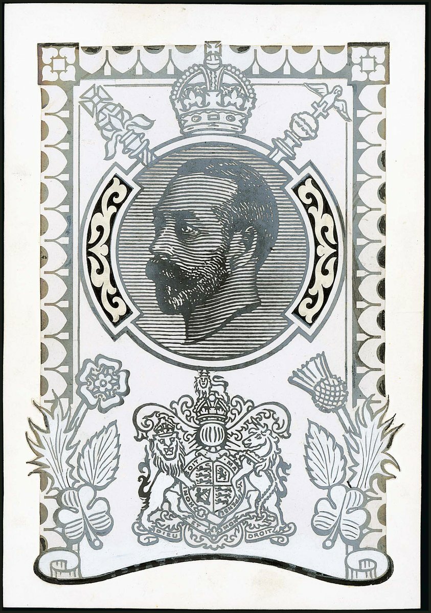 1911 undenominated composite artists essay (115x155mm) for a proposed Coronation issue, believed to be by Bertram Mackennal, based on the Downey Head die proof (stage II), part bromide with the remainder pen, ink and Chinese white. Fine and exquisite. . Photo