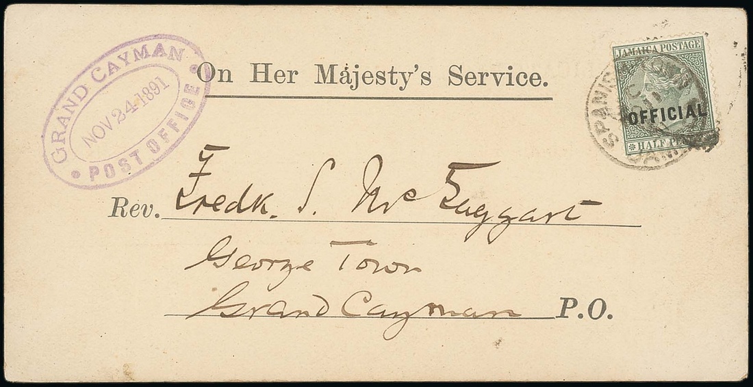 1891 (11 Nov.) O.H.M.S. Marriage Registration details card from Spanish Town to F.S. Taggart, Georgetown, bearing Official ½d. green with thick overprint cancelled with single-ring d.s. and showing, at left, a superb strike of the