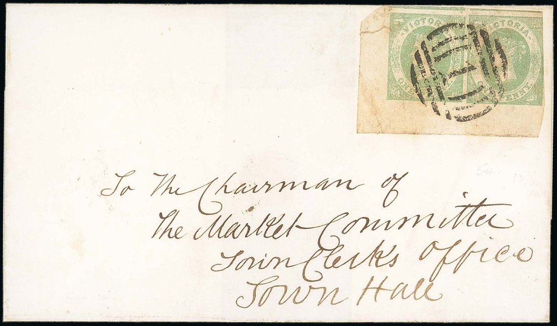 1d. emerald-green, a lower left corner pair with full sheet margins on two sides, centrally cancelled by Barred Numeral "1" on 1860 (11 Aug.) locally addressed entire with Melbourne datestamp on reverse. the tear at upper left which just affects stamp design, pressed crease at tower left and is a touch soiled, nevertheless a most remarkable franking. S.G. 64a. Photo