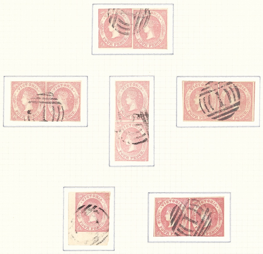 4d. rose group pairs (5, one vertical) and a single from the lower right corner, all touched or just-into in one place otherwise fine and a good range. S.G. 65 group