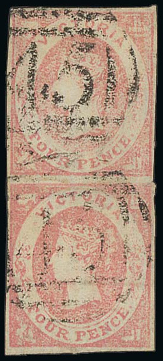 4d. dull rose (oily ink) vertical pair with small to good margins, cancelled by Barred Numeral "45" (Glenorchy), pressed crease between otherwise fine. Rare with pairs being the largest recorded multiple with less than ten known. S.G. 67. Photo
