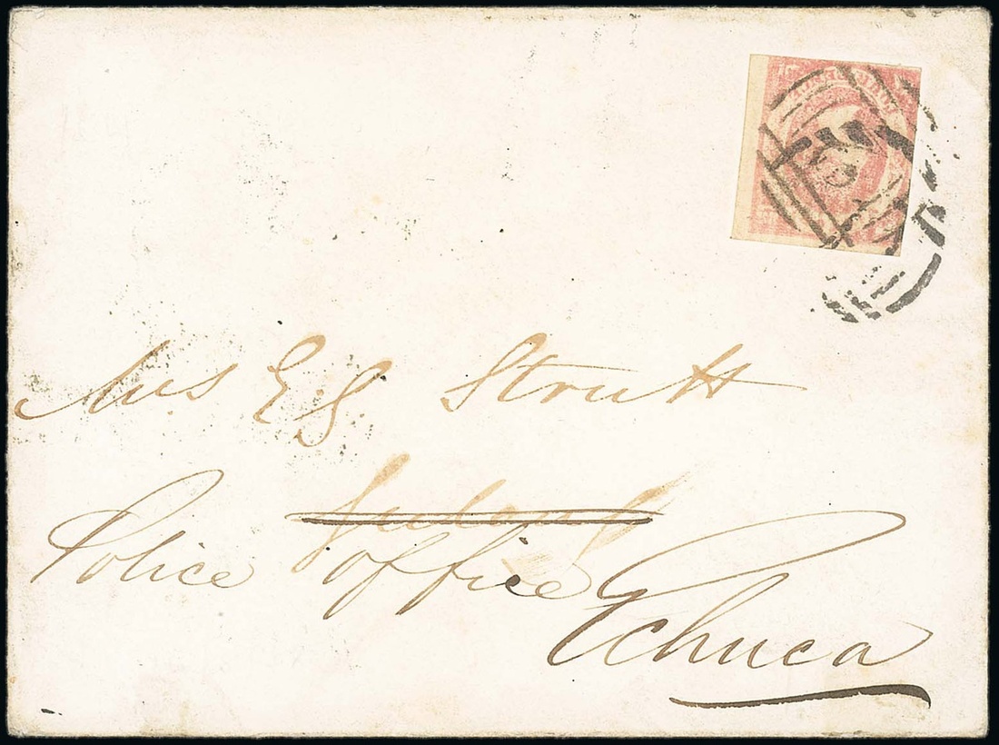 4d. dull rose (oily ink) with large margins on two sides, touched on others, clearly tied on 1858 (8 May) envelope from Melbourne to Geelong and redirected to Echuca with relevant datestamps on reverse. Very scarce, the earliest recorded date for a Robinson Emblem (his tender only being accepted on 6 May 1858). R.P.S. Certificate (1976). S.G. 67. Photo