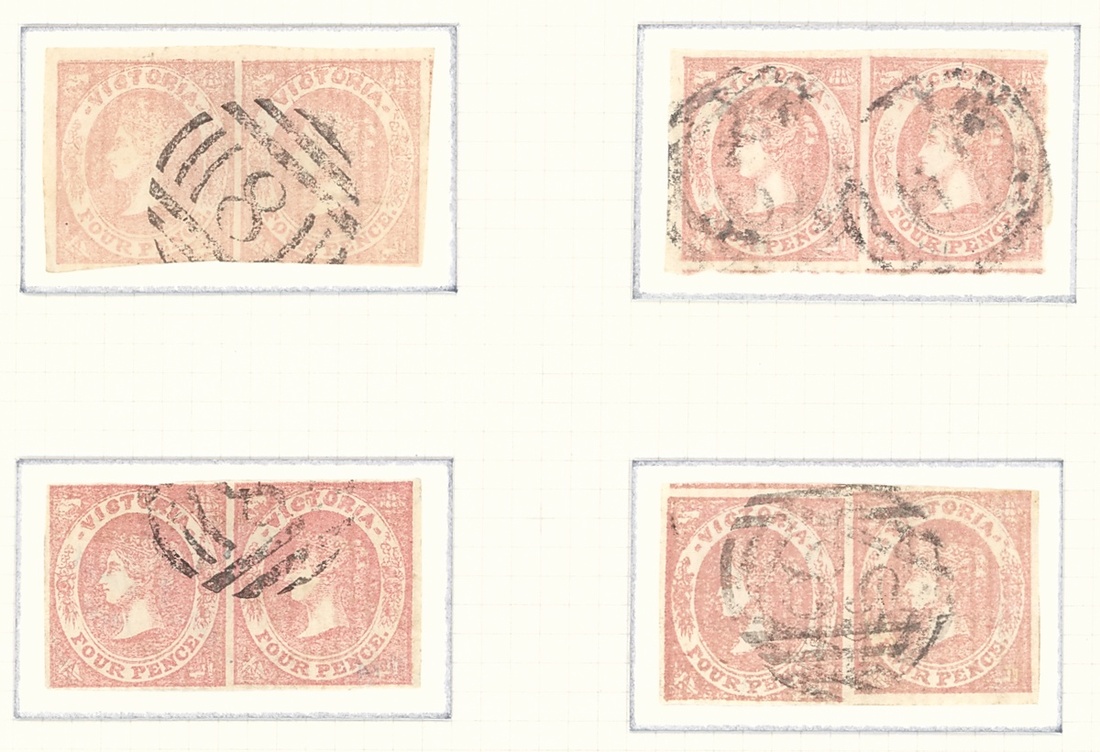 4d. dull rose-red (normal ink), five horizontal pairs, one with gutter between, all touched or just-into on one side and cancelled by Barred Numerals; one with thins and another with vertical crease though a fine looking group. S.G. 68