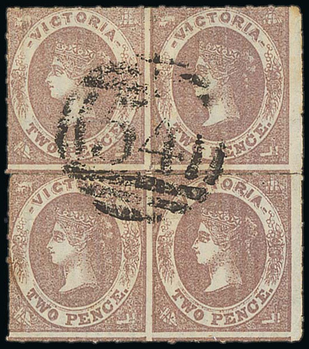 2d. brown-lilac block of four with clear roulettes, centrally cancelled by Barred Numeral "54" (Kilmore), some re-inforcement to roulettes, fine. The largest recorded used multiple. S.G. 69a. Photo