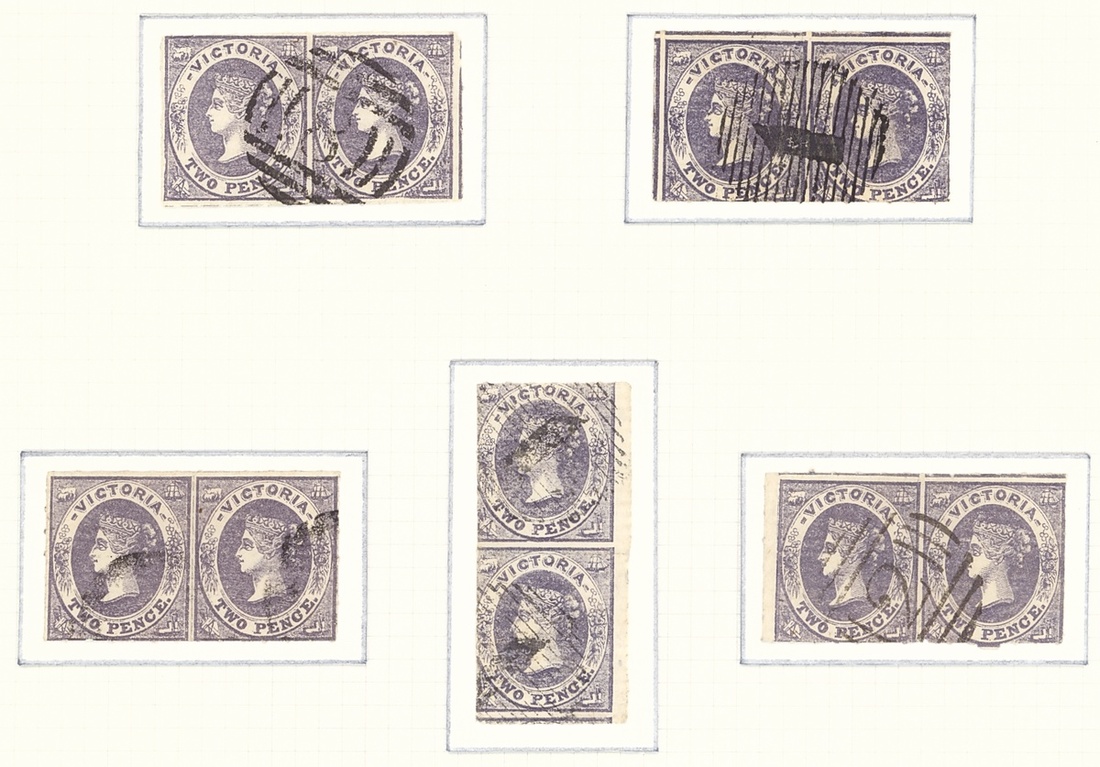 2d. violet shades, pairs (7, one vertical) and a single (one on piece with 4d. and cancelled by