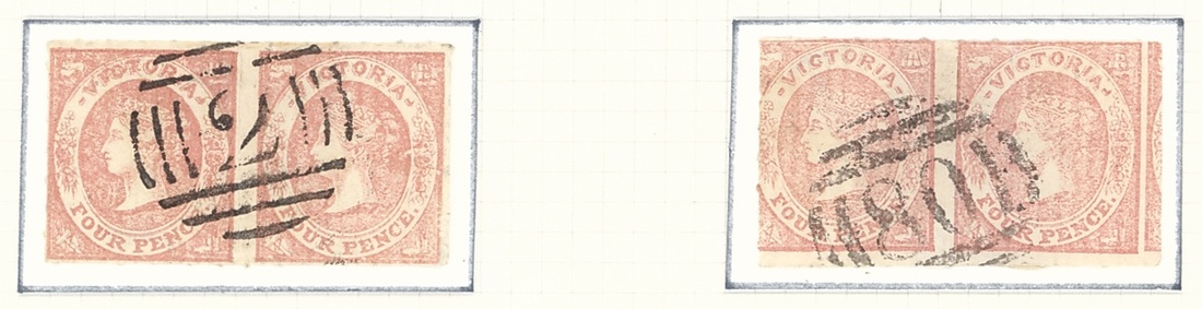 4d. dull rose shades, two horizontal pairs showing vertical gutter between, clear roulettes, cancelled by Barred Numerals "1" and "80" (Swan Hill), fine. Very scarce. S.G. 71