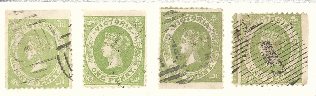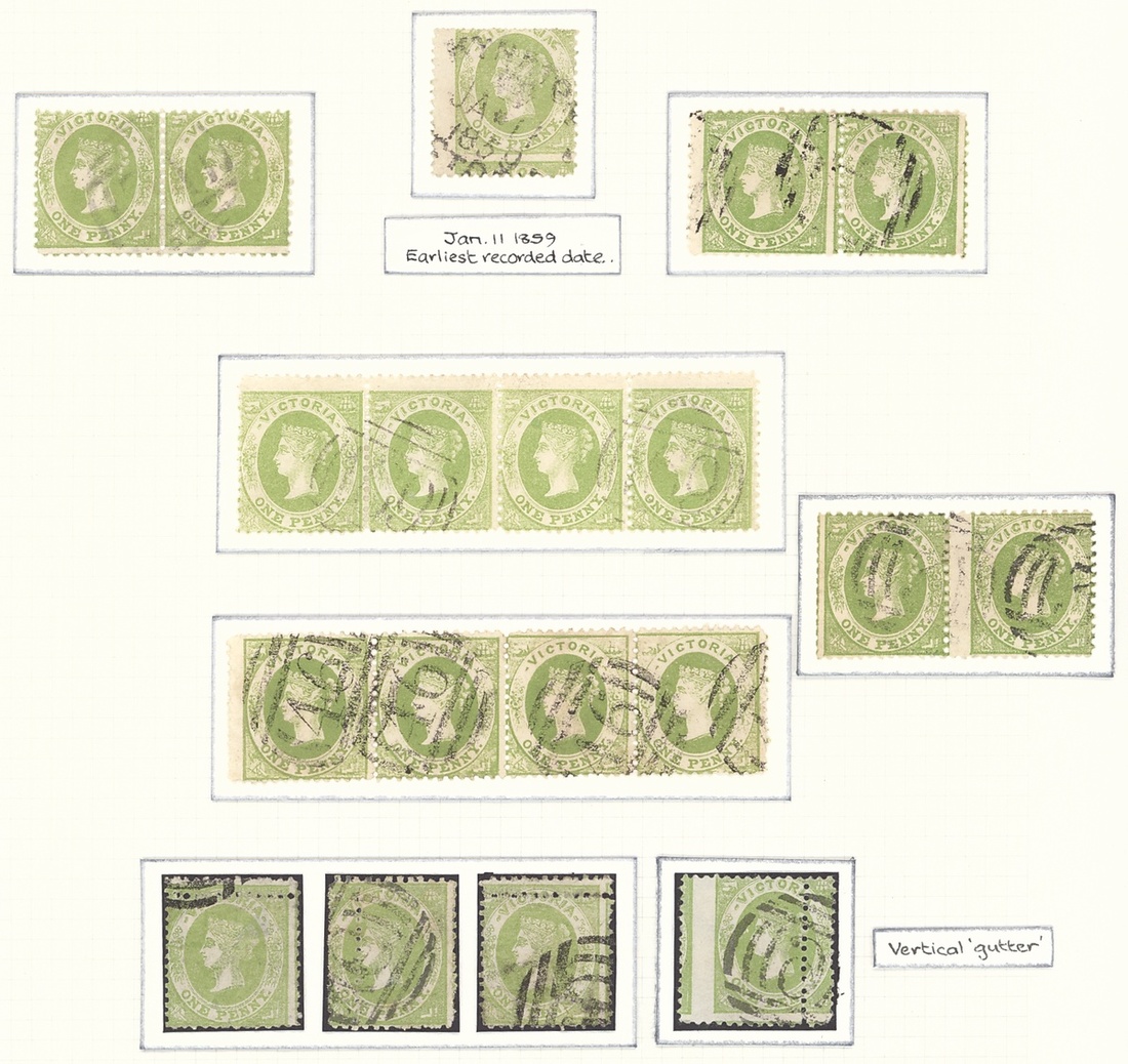 1d. yellow-green strips of four (2) pairs (3, one with gutter margin between) and singles (9, four showing double perforations and one with earliest recorded date), all used, chiefly fine. S.G. 76