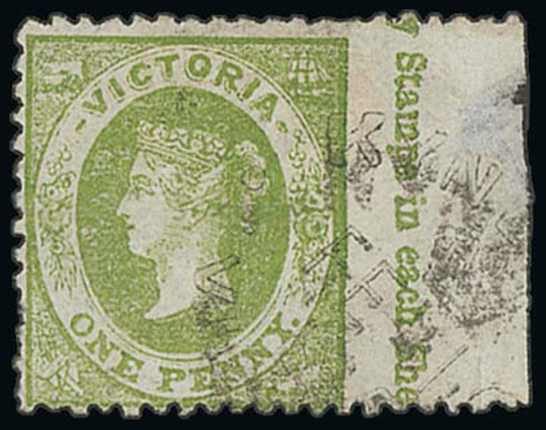 1d. yellow-green with margin at right showing part inscription, a few short perfs and thin in margin otherwise fine used. Rare. S.G. 76. Photo