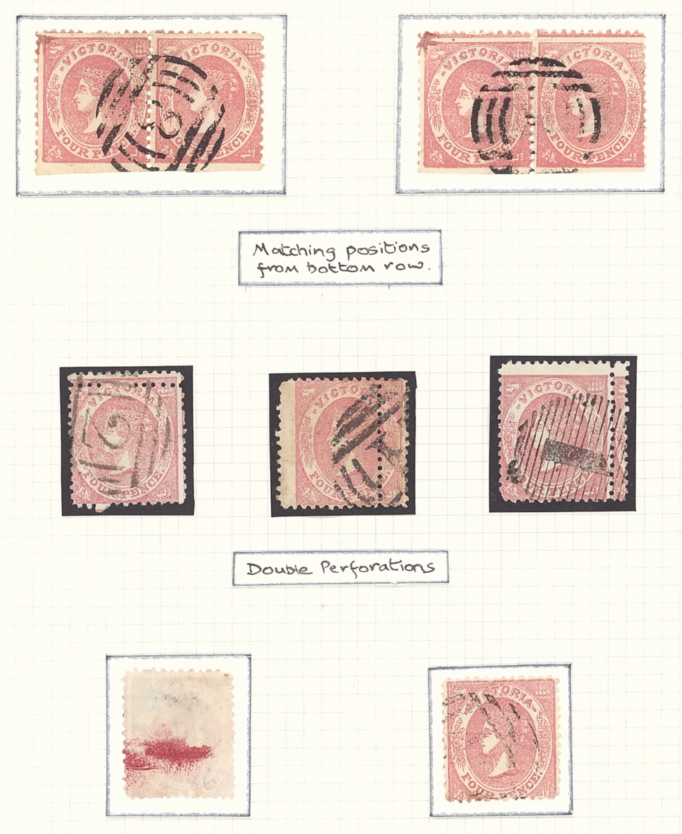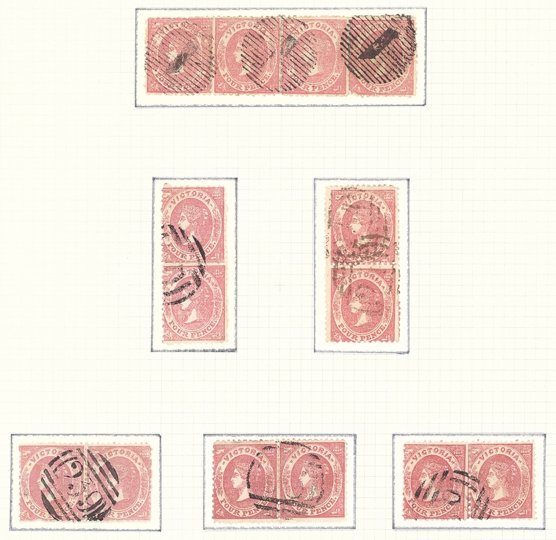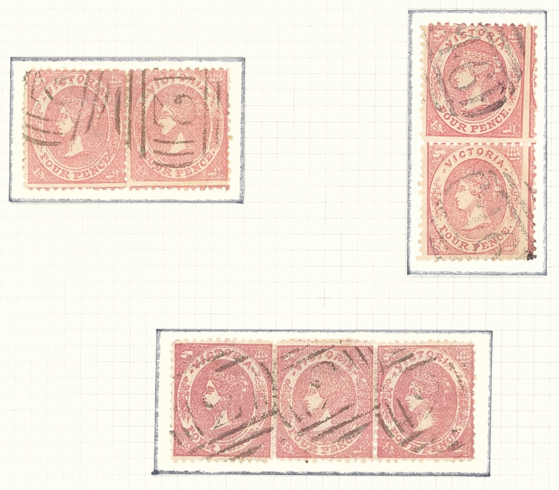 4d. dull rose (shades) strips of four and three, pairs (11, three vertical) and singles (12, three with double perforations, one with horizontal "stitch" watermark and one on front with early date), all used, chiefly fine. A very good lot. S.G. 83