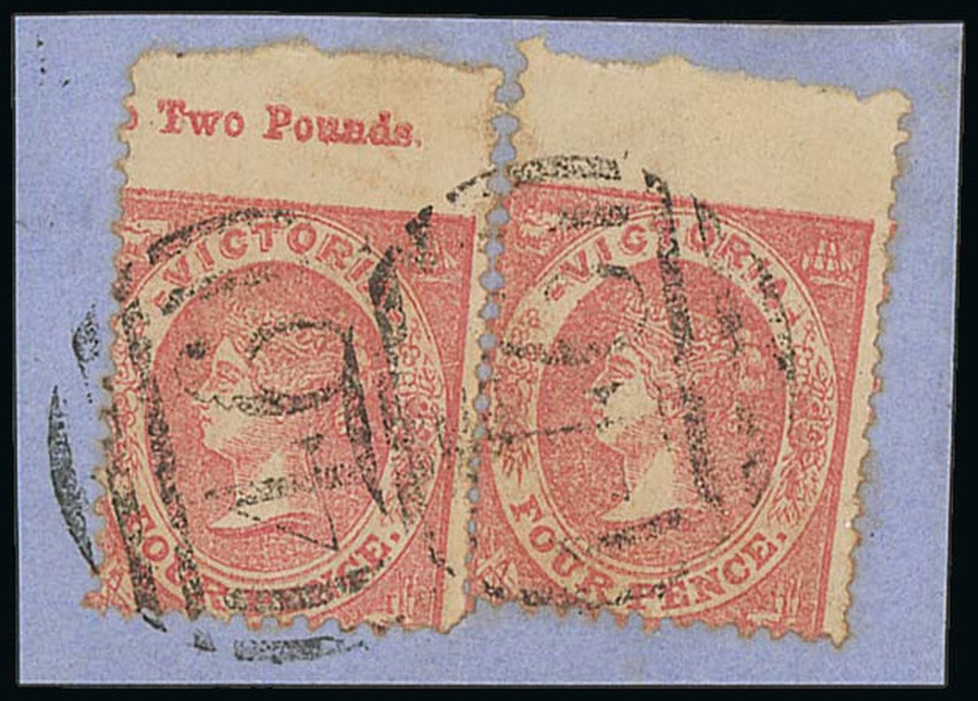4d. dull rose, two top marginal examples on small piece, one showing part inscription, neatly cancelled by Barred Numeral "46" (Hamilton), fine. Rare. S.G. 83. Photo