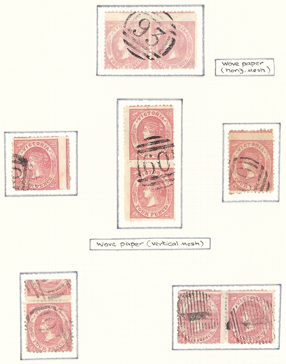 4d. dull rose horizontal pair with horizontal mesh showing gutter margin at top, 4d. dull rose vertical pair and singles (2) with vertical mesh showing gutter margin, plus thick paper 4d. rose-pink with large portion of adjoining stamp at top showing gutter margin between and horizontally laid paper 4d. rose-pink pair with gutter margin between; all used, generally fine. S.G. 83, 85a, 87