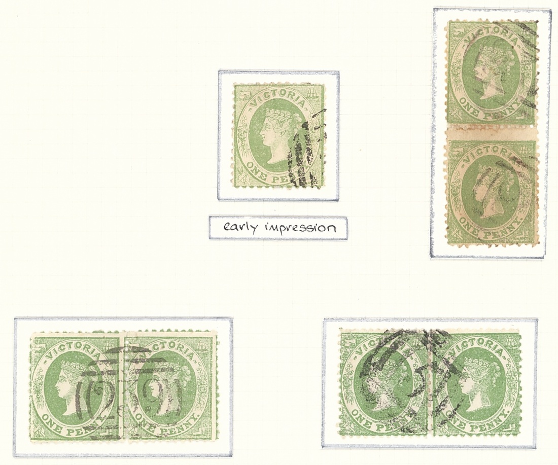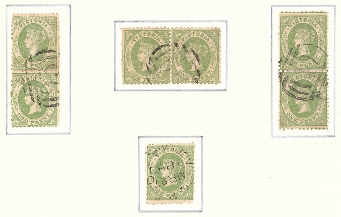 1d. dull green pairs (3, two vertical) and a single, and 1d. green pairs (3, one vertical showing gutter margin) and a single, all used, some a little brown due to gum, fine. S.G. 84, 84a