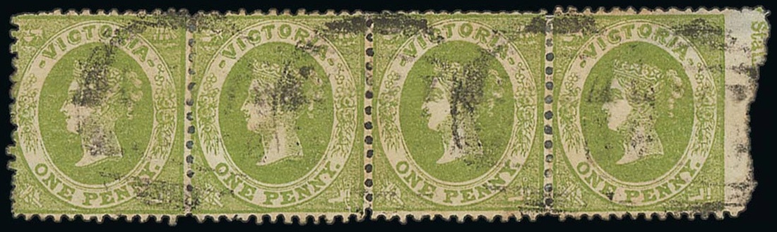 1d. green strip of four with part margin at right with small part inscription, indistinctly cancelled, one with small thin at top and the odd short perf otherwise fine. A very scarce multiple. S.G. 84a. Photo