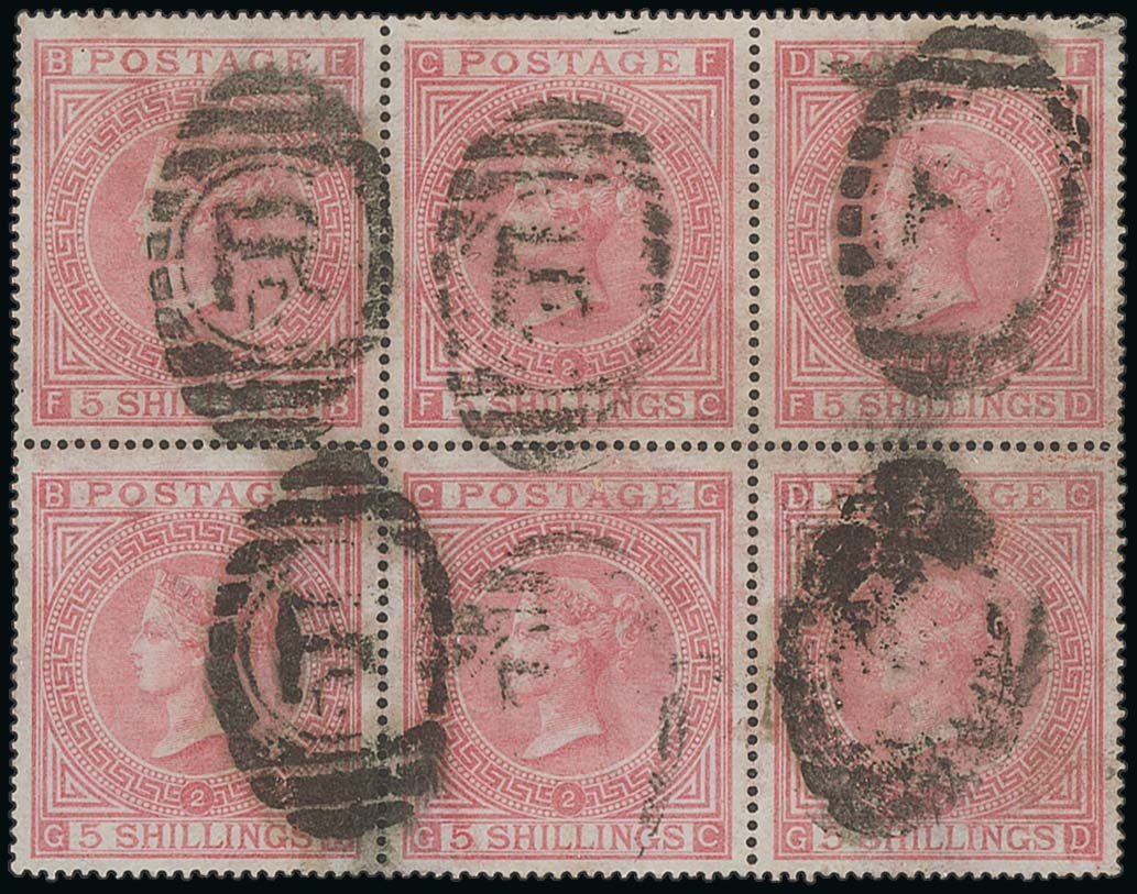 5/- pale rose, plate 2, FB-GD block of six cancelled by good strikes of the large registered barred oval; a couple of trivial imperfections. Sorani Certificate (1991). S.G. 127, £9000 as singles. Photo