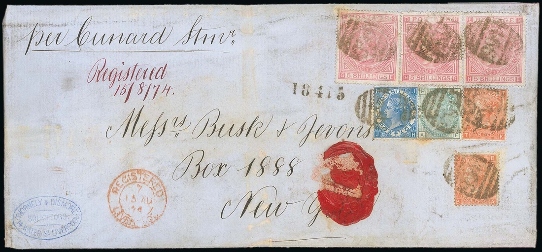 1874 (15 Aug.) large commercial solicitor's wrapper registered to New York "per Cunard Stmr." bearing 1865-67 4d. deep vermilion plate 13 (2), 1867-80 2/- blue, 1867-83 5/- rose (watermark Maltese Cross), plate 1 GE plus HD-HE pair with 1873-80 1/- green plate 9; each cancelled by strikes of the "466" obliterator; manuscript "Registered 15/8/74" in red ink with Registered Liverpool despatch c.d.s., the reverse with New York Registered c.d.s. (26.8) with three wax seals and the pink sealing ribbon still attached. There is a central vertical crease, some wrinkling and some soiling on the reverse, one 5/- with a small patch of colour loss and a couple of light tone spots . A remarkable and appealing franking. Photo
