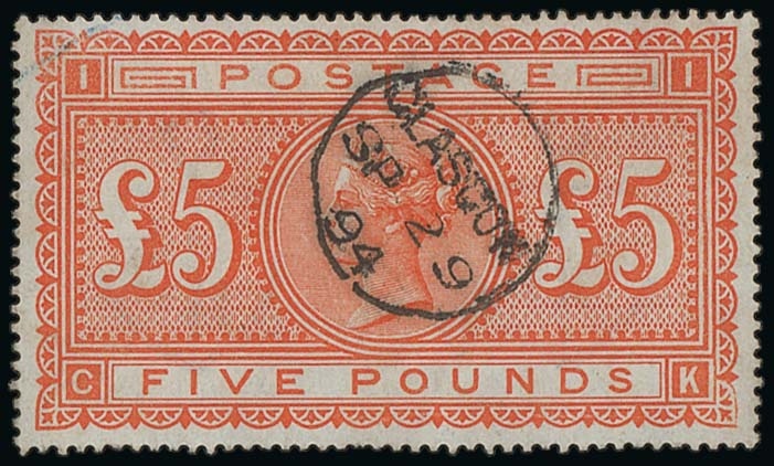 White Paper: £5 orange, CK cancelled by a neat strike of Glasgow c.d.s. dated 1894 (29 Sept.); well centred and fresh colour, there are a few slightly irregular perfs. A good example of this stamp. S.G. 137, £3500. Photo