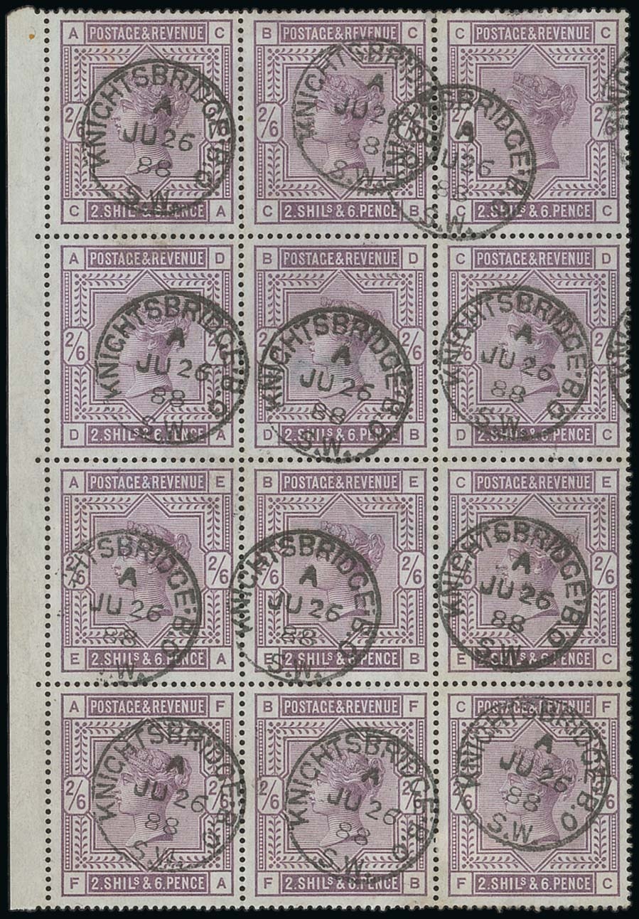 2/6d. lilac. CA-FC left margin block of twelve neatly cancelled by Knightsbridge 1888 (26 June) c.d.s.; fine. S.G. 178. Photo