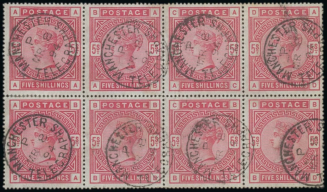 5/- rose, AA-BD block of eight each neatly cancelled by Manchester Telegraphs 1894 (8 Mar.) c.d.s.`