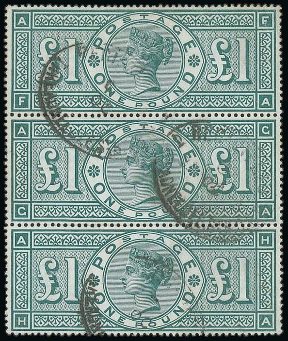 £1 green, FA-HA vertical strip of three cancelled by light strikes of Threadneedle Street registered oval. FA shows variety small break in the top frame line above "