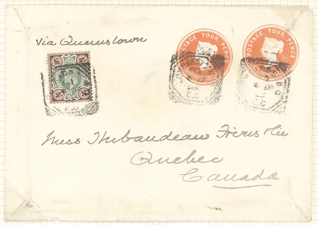 4d. green and brown, a group of covers which includes used on Q.V. 4d. plus 4d. stationery envelope, with ½d. on Q.V. 2½d. stationery envelope registered to Germany, with 1½d. and 6d. on Q.V. 6d. stationery envelope to New York, with 3d. on envelope registered to U.S.A., with Q.V. 1d. stationery cut-out on envelope registered to Germany; also 4d. orange covers (4) each uprated ½d. (9 covers)