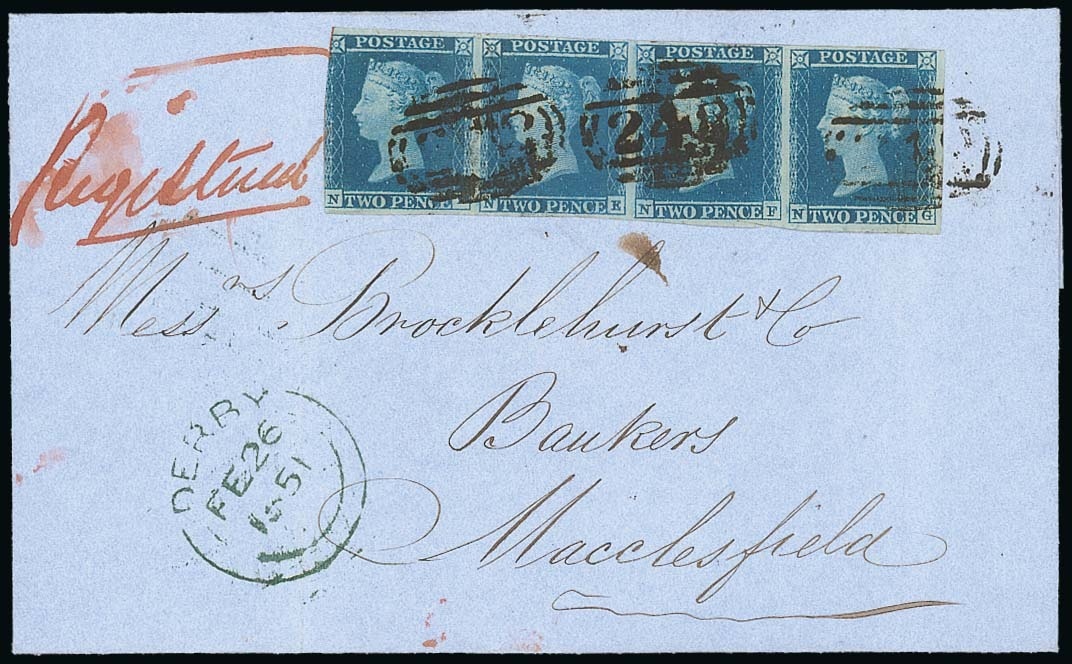 1851 (26 Feb.) Brocklehurst entire to Macclesfield bearing 1841 2d. blue, plate 4, ND-NG strip of four (close to large margins, just cut into at left) tied by "242" numeral with Derby despatch in dark green at foot, marked "Registered" in red ink and with the arrival c.d.s. (27.2) on the reverse. Attractive. Photo
